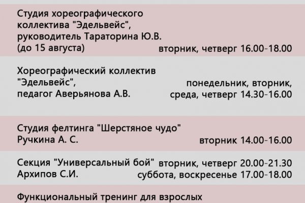 Расписание работы кружков, секций и творческих коллективов на август 2025 г
