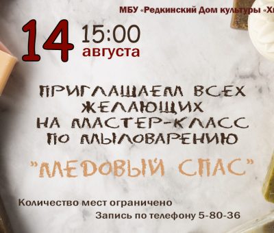 Подробнее14 августа в 15.00 приглашаем всех желающих на мастер-класс по мыловарению "Медовый спас". Количество мест ограничено, запись по телефону: 5-80-36
