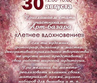 ПодробнееДК «Химик» приглашает стать участниками Арт-базара «Летнее вдохновение», который будет проходить в Доме культуры «Химик» 30 августа с 12.00 до 18.00.