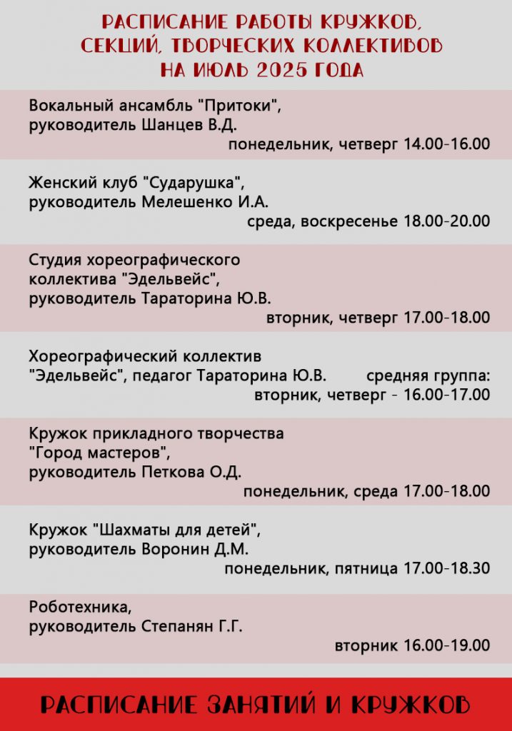 Расписание работы кружков, секций, творческих коллективов на июль 2025 года: